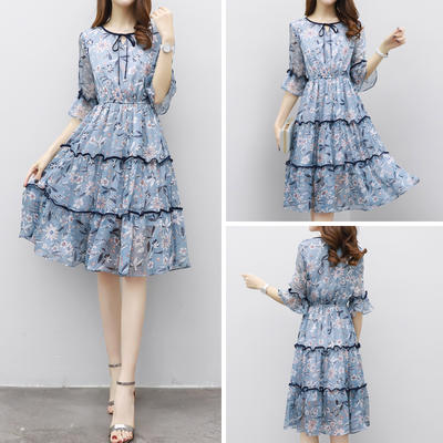 2017夏季新款女装韩版气质显瘦裙子荷叶袖淑女碎花雪纺连衣裙